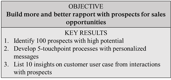 For example, if a company wide OBJECTIVE is to increase revenue by 20% from the previous year, one of its KRs may be to increase revenue through marketing by 20%.